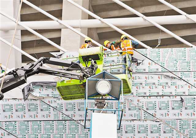 記者在中建八局兩江新區龍興足球場工地看到,20多臺直臂車不停擺動,工人們站在上面,有條不紊地進行金屬屋面及幕墻裝飾作業。他們,正給龍興足球場穿“外衣”。