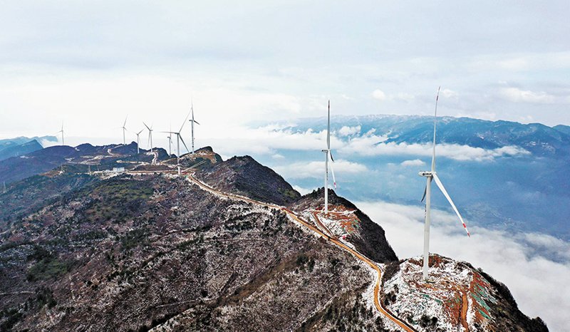 2021年12月30日,積雪和云霧掩映著黔江區五福嶺風力發電場。