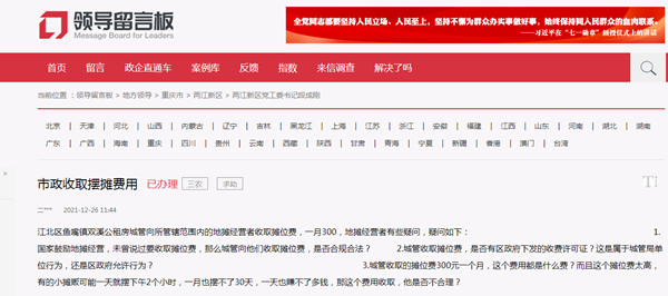 “國家鼓勵地攤經營,未曾說過要收取攤位費,那么收取攤位費,是否合規合法?”2021年12月26日,網友在人民網“領導留言板”上給重慶市兩江新區黨工委書記段成剛留言,對江北區魚嘴鎮雙溪公租房城管所管轄范圍內的地攤經營者收取“攤位費”,一個月300元,這樣行為提出疑問。