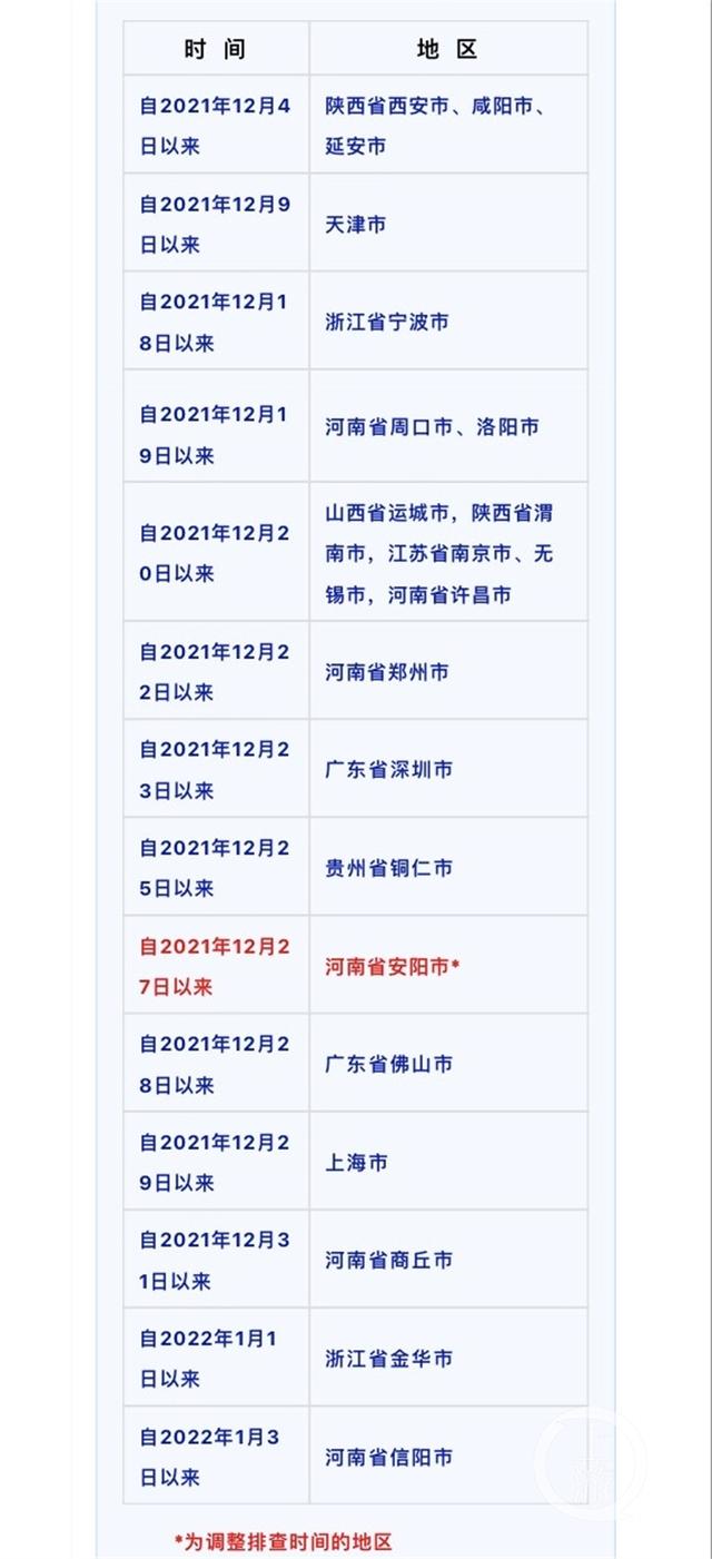 中、高風險區范圍以微信“國務院客戶端”公布為準。陸路邊境口岸城市名單以各省市人民政府公布為準,目前可在微信公眾號“文旅之聲”上查詢到截至2021年12月30日七省區公布的邊境口岸城市范圍。