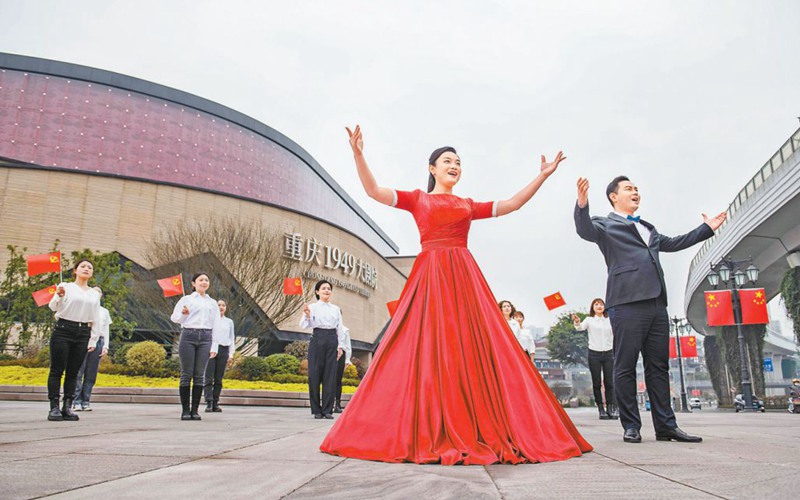 “人民就是江山,寫就你使命擔當……”10日上午,重慶1949大劇院外的廣場上傳來激昂的歌聲,重慶大學藝術學院音樂系副主任喻思言和教師袁筱璇,與來自沙坪壩區女子教師合唱團的成員們一起深情演唱著歌曲《領航》。