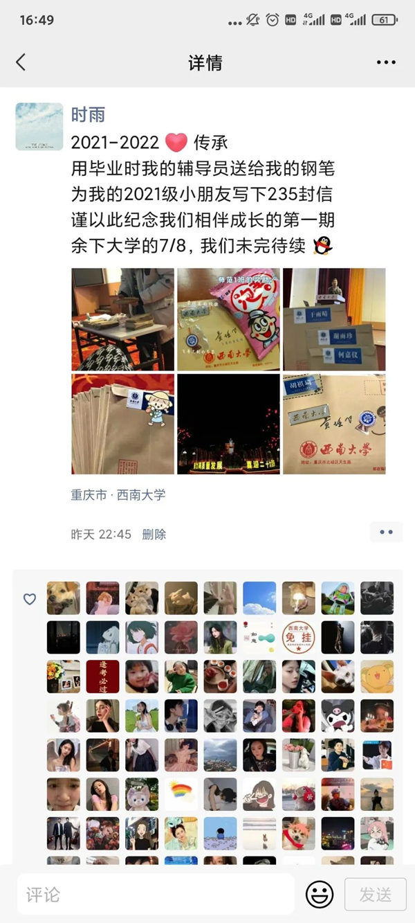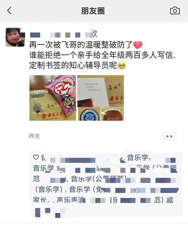 作為“00后”的大學生,不少同學表示,這是第一次收到親筆信,他們在朋友圈里刷屏感嘆:“誰能拒絕一個親筆給全年級200多人寫信+定制書簽的輔導員,這樣的輔導員誰不愛呢?”