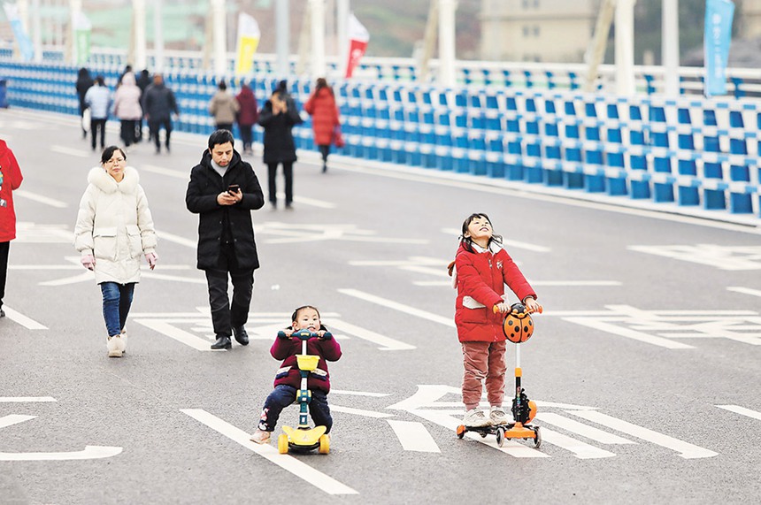 1月22日,市民在白居寺長江大橋“踩橋”,游覽、拍照,感受橋梁的壯美。