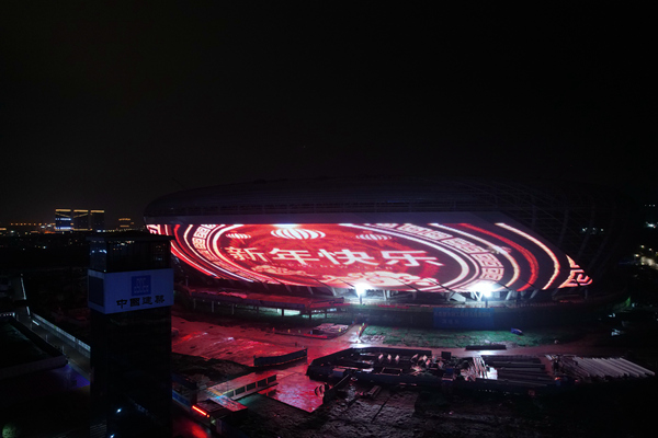重慶龍興足球場項目12000平方米特大LED光電幕墻順利亮燈。中建八局供圖