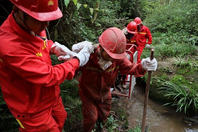 鉆井員工深溝險壑中,艱難搬遷鉆機。西南物探分公司供圖