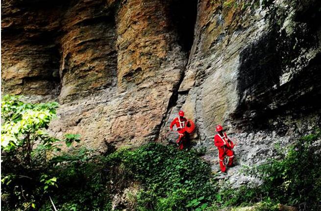 工區地形高陡復雜,排列員工在陡崖下布設采集電纜。西南物探分公司供圖