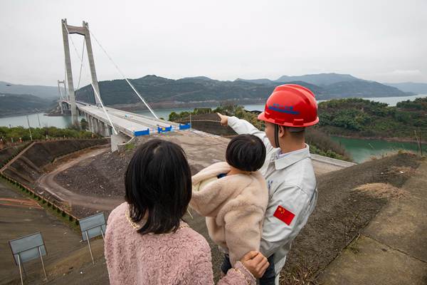 帶著妻子孩子看大江大橋。冉孟軍攝