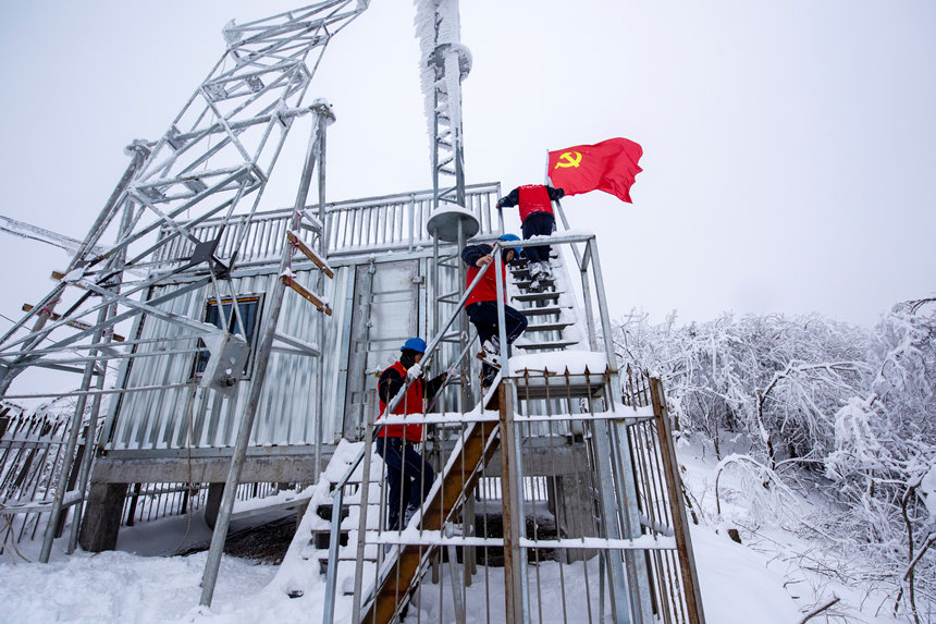 國網重慶城口供電公司員工楊順安、冉昊天在220千伏華城線237號塔測量覆冰厚度。牟丹陽攝