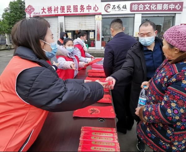 人民網重慶1月29日電 辭牛歲,迎虎年,喜氣洋洋寫春聯。為營造喜慶的節日氛圍、豐富轄區廣大群眾的節日文化生活,1月26日,巴南區石龍鎮在文化服務中心開展了迎新春贈春聯、“百本好書送你讀”主題活動。