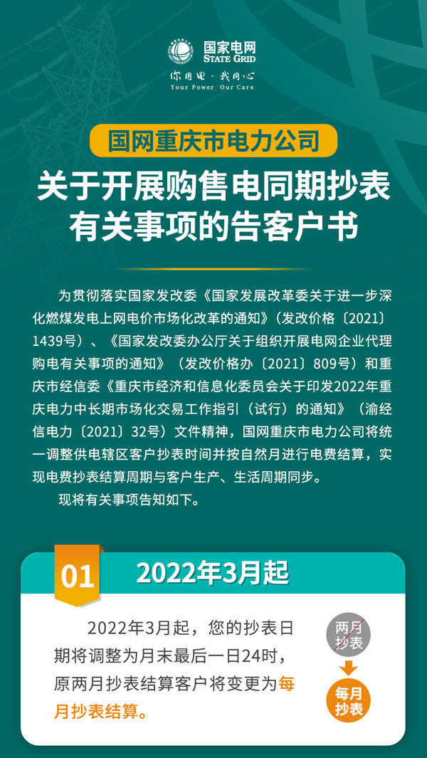 人民網重慶2月8日電 (劉政寧)2月8日,國網重慶市電力公司對外發布《關于開展購售電同期抄表有關事項的告客戶書》。今年3月起,國網重慶市電力公司將統一調整供電轄區客戶抄表時間并按自然月進行電費結算,實現電費抄表結算周期與客戶生產、生活周期同步。抄表日期將調整為月末最后一日24時,原兩月抄表結算客戶將變更為每月抄表結算。