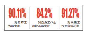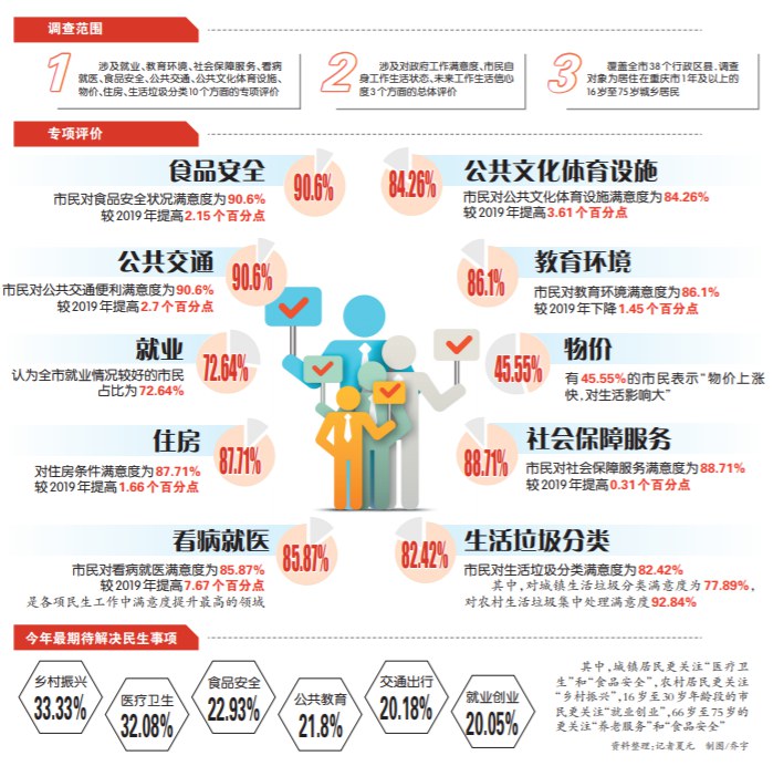 記者2月9日從市統計局獲悉,重慶市社情民意調查中心開展的2021年度專項民意調查結果顯示,重慶市民對政府工作滿意度達到90.11%,對自身工作生活狀態滿意度達到84.2%,對未來工作生活信心度達到91.27%。