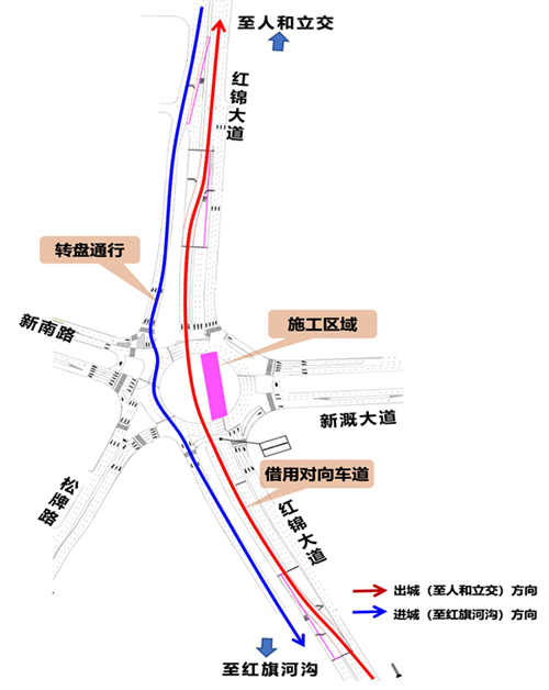 具體疏導方案為:1.原紅錦大道通過新牌坊立交下穿道進城的車輛(或往紅旗河溝方向)改道為:由紅錦大道—紅錦大道輔路(中國電信)—新牌坊立交轉盤—紅錦大道輔路—紅錦大道行駛。2. 原紅錦大道通過新牌坊立交下穿道出城的車輛(或往人和立交方向)不受影響。