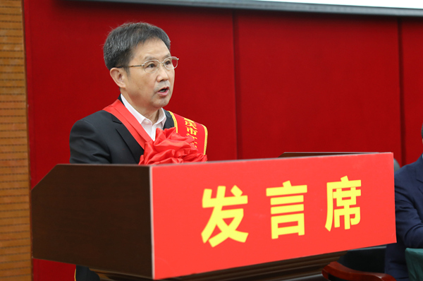 重慶智飛生物制品股份有限公司黨委書記、董事長、總裁蔣仁生發言。江北區委宣傳部供圖