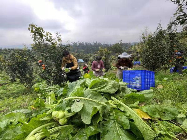 村民正在采摘柑橘園內成熟的青菜。銅梁區委宣傳部供圖