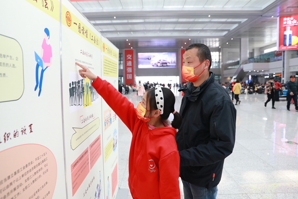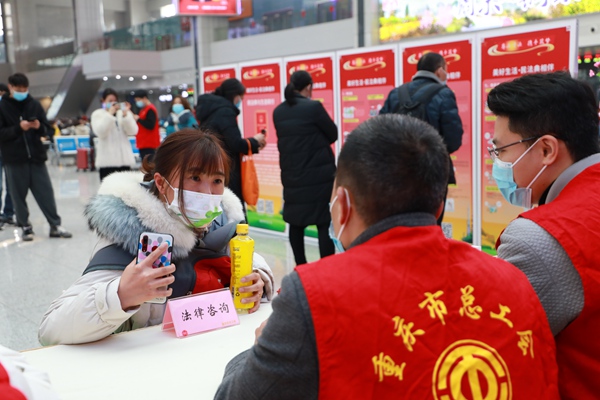 為向外出務工人員開展普法宣傳活動,引導外出務工人員樹立法治意識,自覺學法遵法守法用法,依法理性維護自身權益,2月15日,重慶市總工會聯合重慶火車站在重慶北站候車廳開展了“春風送法律·平安萬里行”專場普法宣傳活動。