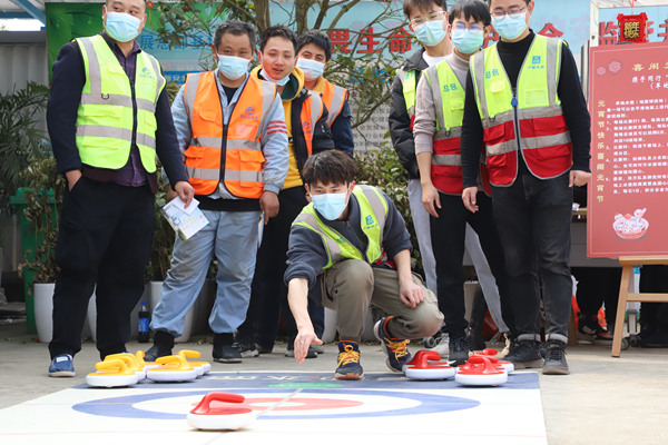 活動現場,既有感受傳統文化的猜燈謎,又有互動感極強的趣味運動:“在悅來,愛悅來,一起向未來”拼圖游戲,參賽組全力合作以最短時間展現悅來中心項目效果圖,鼓勵大家為項目建設作貢獻;“攜手同行,‘悅’來越好”——旱地冰壺游戲讓工友們在工地感受到運動的樂趣;“團結就是力量”——安全帶拔河比賽以安全帶為紐帶,獨具工地特色,在趣味運動中提升安全意識。同時,還有“聲聲報! “團團圓圓(夾元宵)”“套圈”等游戲,各項活動在歡快喜慶的氣氛中秩序井然地進行,活動現場到處洋溢著喜悅和歡聲笑語。