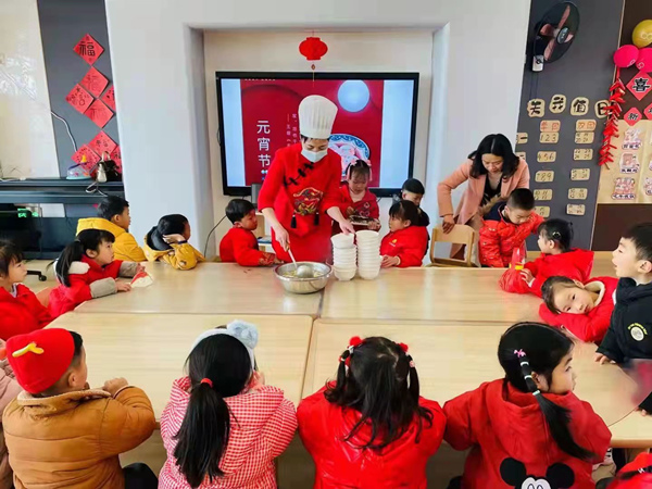 在各個班級的門口,一一擺放著包含冬奧元素的歡迎牌。跟隨園長走進各個班級,提早報到的家長與小朋友們正在教室內參與畫冬奧吉祥物、做花燈等活動。手工活動結束后,園方還組織各個班級在本班的小廚房內煮了元宵湯圓,讓小朋友們一一品嘗,吃到了甜甜的湯圓,大家的臉上都洋溢著幸福的笑容。