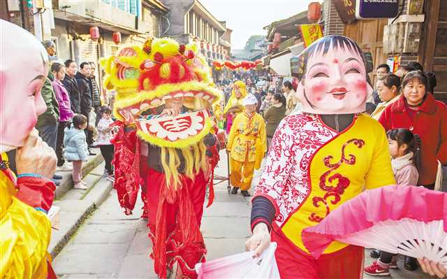 2月15日,重慶高新區走馬鎮,舞獅隊在老街巡游。記者 張錦輝 攝/視覺重慶