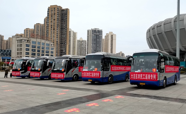 人民網重慶2月17日電 春暖農民工,節后再出發! 17日上午11點,在大足體育中心,229名即將啟程前往廣東的務工人員集結完畢,經由政府統一組織的大巴車前往大足南站,他們登上了當天14點48分的定制返粵專列D1851次列車。