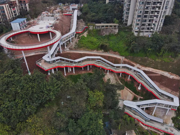 人民網2月21日電 紅色步道沿著山體蜿蜒而下,步道內還有圓形的觀景平臺。近日,隨著南岸區蘇家壩步道觀景平臺主體工程全部完工,這個便捷又美麗的新景觀,未通先火了起來,目前工人正加緊綠化和裝飾收尾工作。