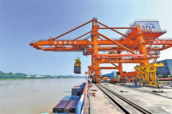 重慶第四大長江樞紐港江津珞璜港正在進行吊裝作業。江津區委宣傳部 供圖