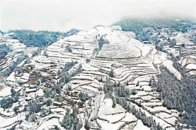 2月22日,“春雪”覆蓋著黔江區中塘鎮雙石村的“脫貧茶園”。當天,受冷空氣影響,黔江區海拔600米的地區白雪皚皚。特約攝影 楊敏/視覺重慶