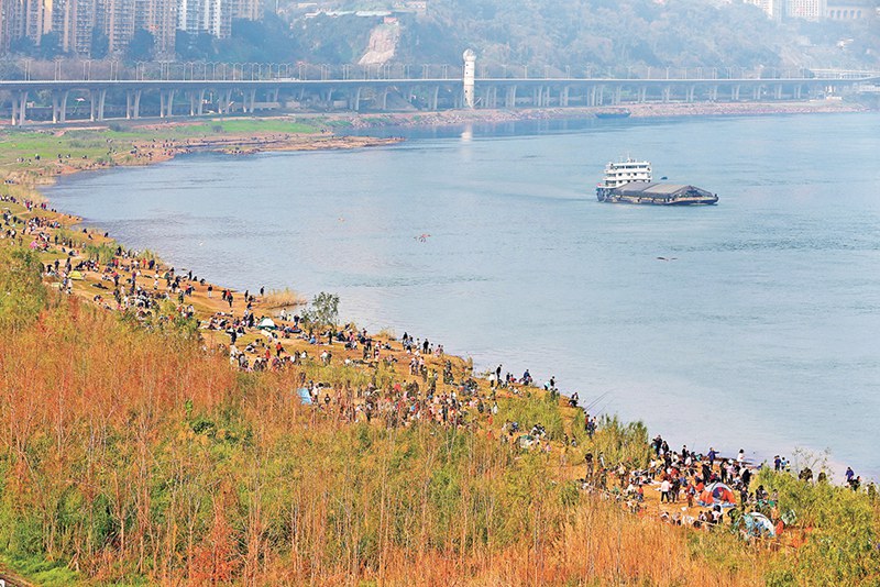 2月27日,重慶九龍坡,市民在經過生態修復后的長江九龍灘消落帶上休閑游玩。特約攝影 鐘志兵/視覺重慶