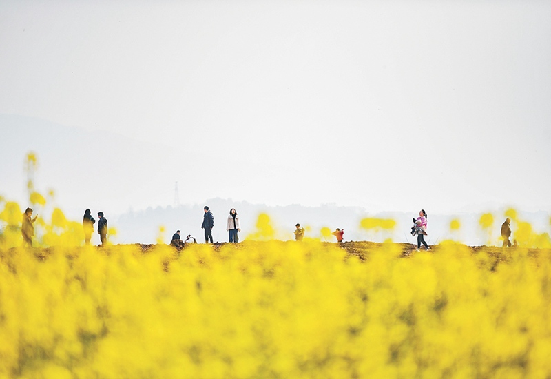 2月27日,重慶廣陽島,市民在油菜花田旁迎著陽光放風箏。記者 謝智強 攝/視覺重慶