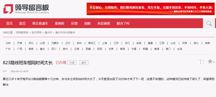 人民網重慶3月2日電 (陳琦)“823路公交車最近每天都要等十幾分鐘,車與車之間到站時間太長了,今天甚至出現了20分鐘才來下一班,這種情況已經持續很久,希望能得到解決!