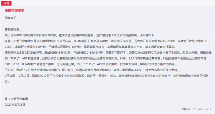 網友留言三天后,重慶交通開投集團回復:經所屬公交集團西部公交公司核實,823路運行五龍廟至芳草地,線長運行14公里,五龍廟開收班時間為6:15-22:00,芳草地開收班時間為6:15-22:00,高峰班次間隔為4-6分鐘,平峰班次間隔為6-10分鐘,現配備運力31臺,車輛每班車載客量55人左右,基本滿足乘客出行需求。