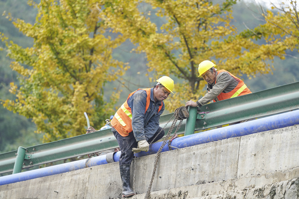 2021年10月29日在重慶市北碚區天府鎮中心村,重慶碚江水務的施工人員在安裝供水管道。秦廷富攝