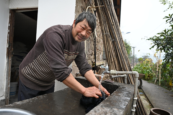 2021年12月14日金刀峽鎮勝天湖村、永安村部分飲水安全鞏固提升項目完成,圖為永安村呂家壩組余玉勝用自來水清洗衣物。北碚區水利局供圖