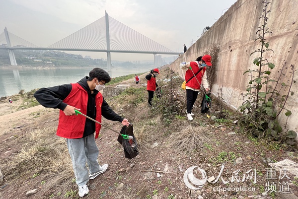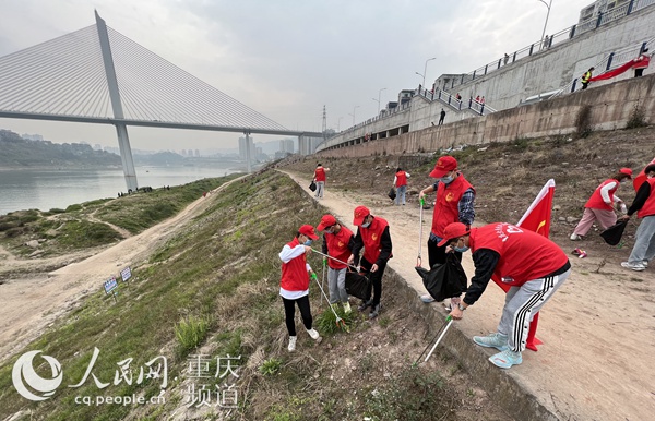 志愿者們在拾撿江邊垃圾。人民網 胡虹攝