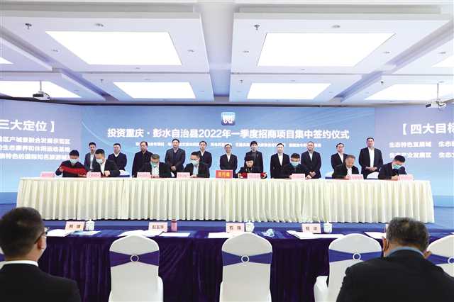 2月28日,彭水2022年第一季度招商引資項目集中簽約暨重點項目集中開工活動如約而至。22個重點項目集中開工,14個項目簽約落地,涉及總投資金額100.6億元的“大禮包”,正式拉開了彭水新一年的沖刺發展。