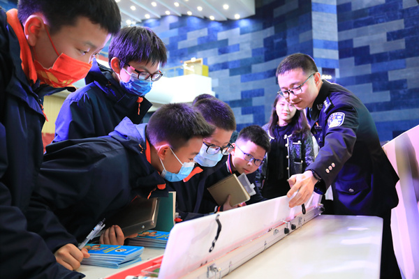 民警周圍現場向同學們介紹仿真毒品。胡曉未攝