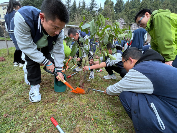 隨后,同學們來到植樹場地開展植樹活動。有的同學挖坑松土,有的同學搬來樹苗,有的同學填土,有的同學打水澆水,很快一支支樹苗都種好了,每一組同學還用馬克筆書寫了牌子,掛在自己種下的樹苗身上,“愿我們都能成為想成為的人!彼麄冇眉恼Z的方式為自己的人生“種下”春天的希望。