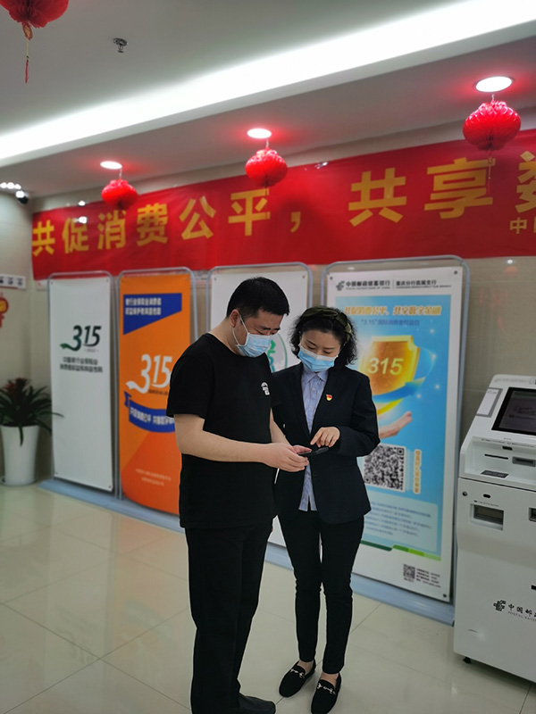 此外,郵儲銀行重慶分行直屬支行沙坪壩區支行營業部和九龍坡區白市驛支行還采用線上宣教和線下特色活動相結合的方式積極開展“3.15”消費者權益保護教育宣傳活動。在營業廳現場擺放金融知識課堂海報、運用營業網點LED屏、多媒體電視、自助設備等設施宣傳金融知識,同時現場設置網紅朋友圈打卡裝置等“3·15”消費者權益保護教育宣傳主題元素。在營業廳辦理業務的消費者可以通過掃描二維碼走進金融知識課堂,或通過參與線上答題、玩游戲、做任務等輕松學習金融知識內容,還能化身金融知識宣教大使拍攝“3·15”消費者權益保護宣教主題視頻,內容包括防范電信網絡詐騙、個人信息保護、理性消費、依法維權等,將金融知識通過朋友圈傳遞給身邊的親朋好友。