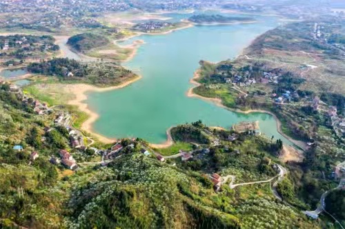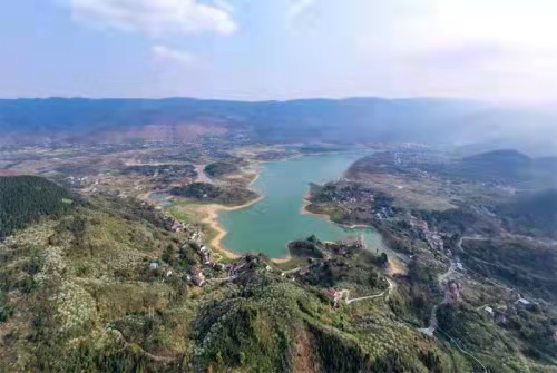廣安華鎣市利用華鎣山天池湖畔治理后的石漠化土地栽植的“天池脆李”,每到春天到來,湖畔漫山遍野如雪的李花把天池湖映襯得美侖美奐,恰似“錦繡花湖”。(華鎣市融媒體中心)
