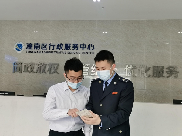 在潼南區行政服務中心的各窗口前,潼南區稅務局聯合區市場監督管理局為市民解答發票維權的相關問題??秭z
