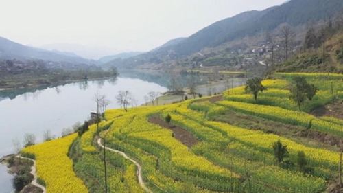 人民網重慶3月18日電 當溫暖的春風劃過一江碧水,阿蓬江畔的春天如約而至。在黔江區阿蓬江鎮大坪村阿蓬江沿線,成片的油菜花形成了長達數公里的花帶,與一江碧水相映成景。