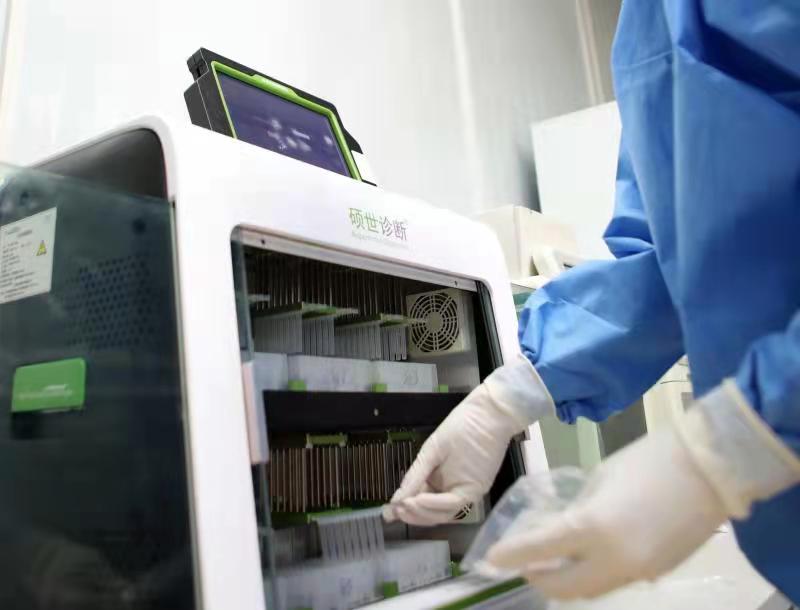 醫務人員在核酸檢測實驗室插入磁套(防污染)。陳仕川攝