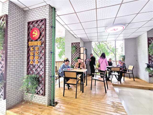 江北區五里店街道南方上格林小區黨員群眾在小區黨群驛站學習交流