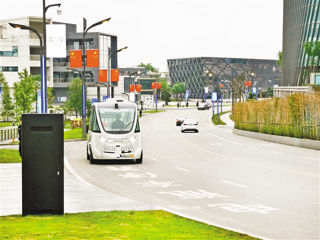 仙桃數據谷,無人駕駛L4級擺渡接駁車在路上行駛。(資料圖片)記者 張亦筑 攝/視覺重慶