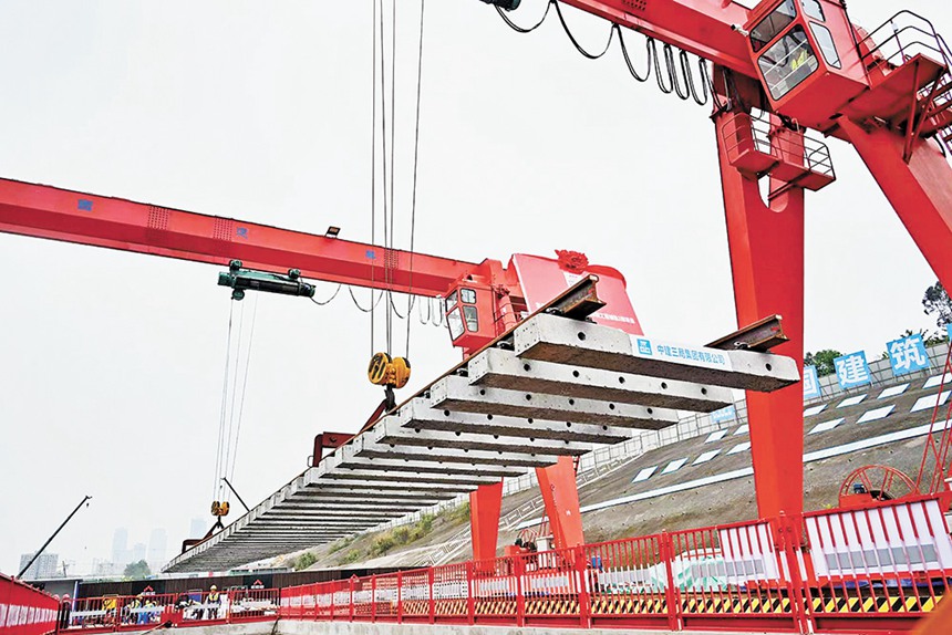 3月25日上午,渝北區中央公園在建的甘悅大道地鐵站附近,隨著鋪軌機將首根長25米、重14噸的軌排穩穩地落在軌道上,標志著地鐵5號線北延伸段正式進入鋪軌施工階段,全線有望年底建成通車。地鐵5號線北延伸段工程線路全長8.64公里,線路起點接5號線一期工程園博中心站,止于悅港北路站,設車站7座。文/記者楊永芹 圖/中建隧道提供