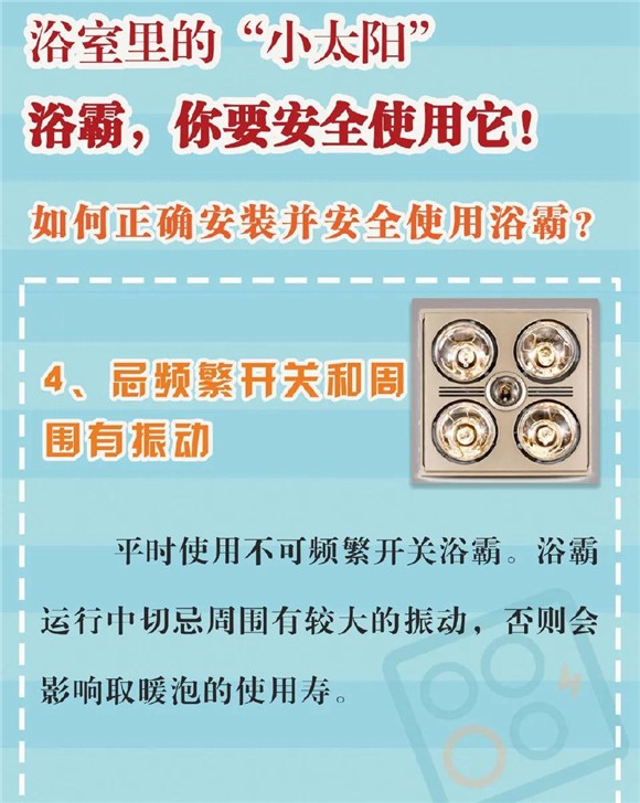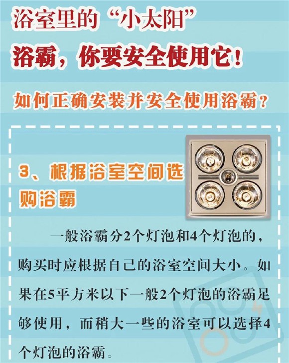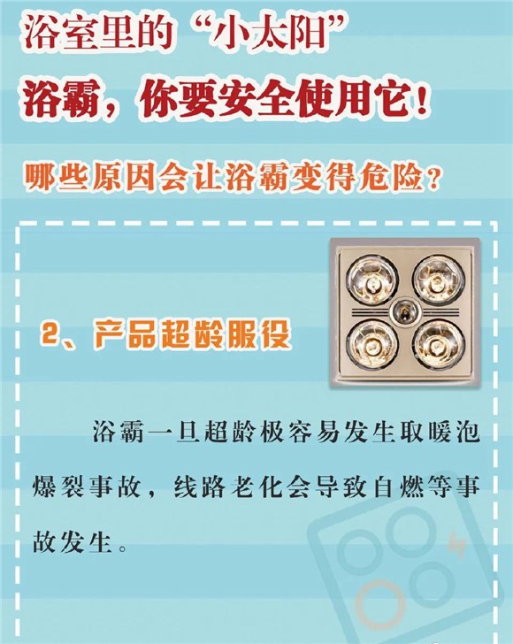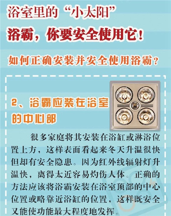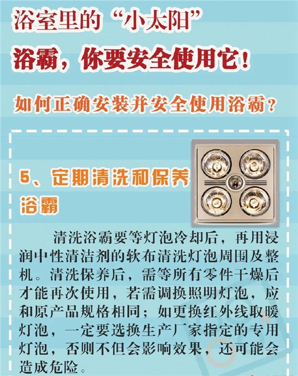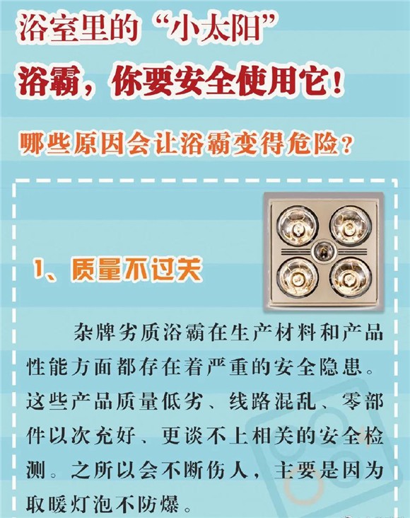 據了解,冬季,很多人在洗澡時,會用上取暖神器——浴霸。最常用的是“燈暖型浴霸”,它不需要長時間預熱,能快速升溫,非常方便。但浴霸也存在一定的安全隱患,如果不規范使用,可能會造成觸電、火災、爆炸等悲劇。(楊雯翕)