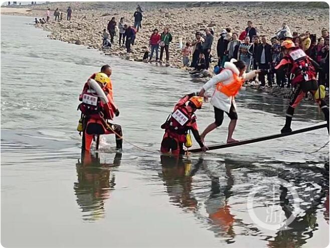 執法艇到達后,發現現場的水深不具備靠泊條件,無法迅速提供救援。隨后,執法人員立即與北碚區公安消防及區航道處溝通,最后決定通過水域救援繩索及救生圈等設備橫渡救援。就這樣,消防戰士沖鋒在前,執法人員一旁輔助,開展了一場“小孩老人在中間,消防戰士在兩邊,執法艇在周圍”的救援行動,為被困群眾搭建起了一座“生命橋梁”,最終有驚無險地抵達岸邊。