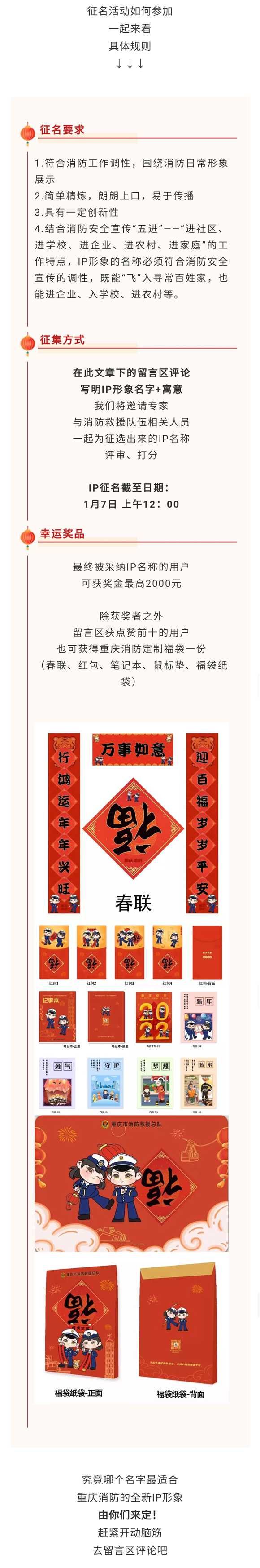 新的一年,重慶消防迎來了兩位新成員,為我們送上了新年祝福,“藍朋友”和“藍姐姐”作為重慶消防新晉代言人有一個響亮的名字也是必不可少的。因此,重慶市消防救援總隊請廣大“藍粉”集思廣益為他們取一個最響亮的名字。1月6日,重慶市消防救援總隊發出征名活動如何參加,一起來看具體規則吧!究竟哪個名字最適合,重慶消防的全新IP形象,由你們來定。ㄍㄓ崋T 陳啟唯)