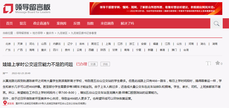 網友在2月23日的留言中稱,從九龍坡區翼龍路北段到軌道陳家坪之間有大量學生就讀高新育才學校,特別是五臺山立交站的學生最多!暗窃摼路只有466一路車,學生和家長幾乎把466擠爆,甚至部分學生需要多等3輛車才能坐到。由于上車人數過多,還造成大量公交車在此排隊和擁堵!睂Υ,他建議在工作日上學時間段內(早7:00-8:00),增加該路段公交車運營能力。