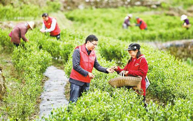 3月28日,豐都縣雙龍鎮茶園首次進入采摘期,當地400多戶村民預計增收480萬元。該鎮探索“公司+支部+合作社+農戶”黨建引領產業發展新模式,成立26個茶產業發展先鋒隊,176名黨員干部擔任先鋒隊員,主動認領茶葉監管責任田,全過程參與茶葉栽植、除草、施肥、修枝整形等各個環節監督管理,以黨員干起來帶領群眾干起來。僅三年時間,雙龍鎮就新發展茶葉6000畝,初步建成豐都最大規模茶產業示范園,實現經濟效益、生態效益雙提升。圖為黨員先鋒隊成員正在茶園培訓村民采茶。