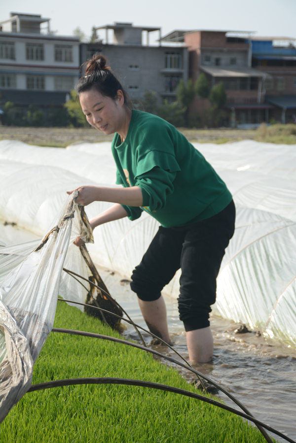 趙興玲察看水稻秧苗長勢。余林駿攝